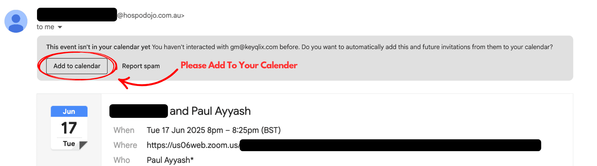 Please check your calendar to make sure the booking has been added. If you don’t see it, look for an email titled “Invitation from an Unknown Sender” and click the grey “Add to Calendar” button to confirm it’s saved.